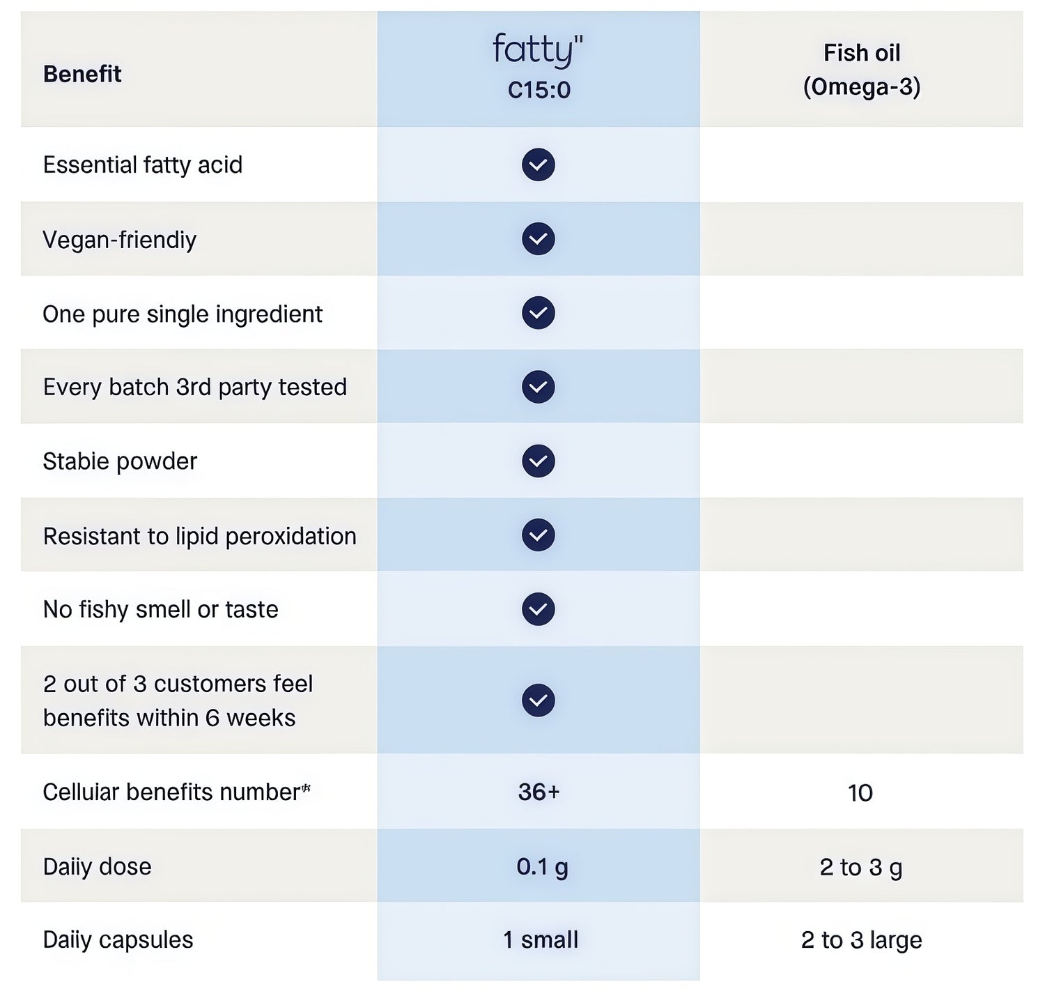 Fatty15 complements Omega-3, offering 3× more cellular benefits than EPA. It supports mitochondria, reduces oxidative stress, and targets aging pathways. Pure and free from extra fats, it provides unique benefits without fishy aftertaste.
